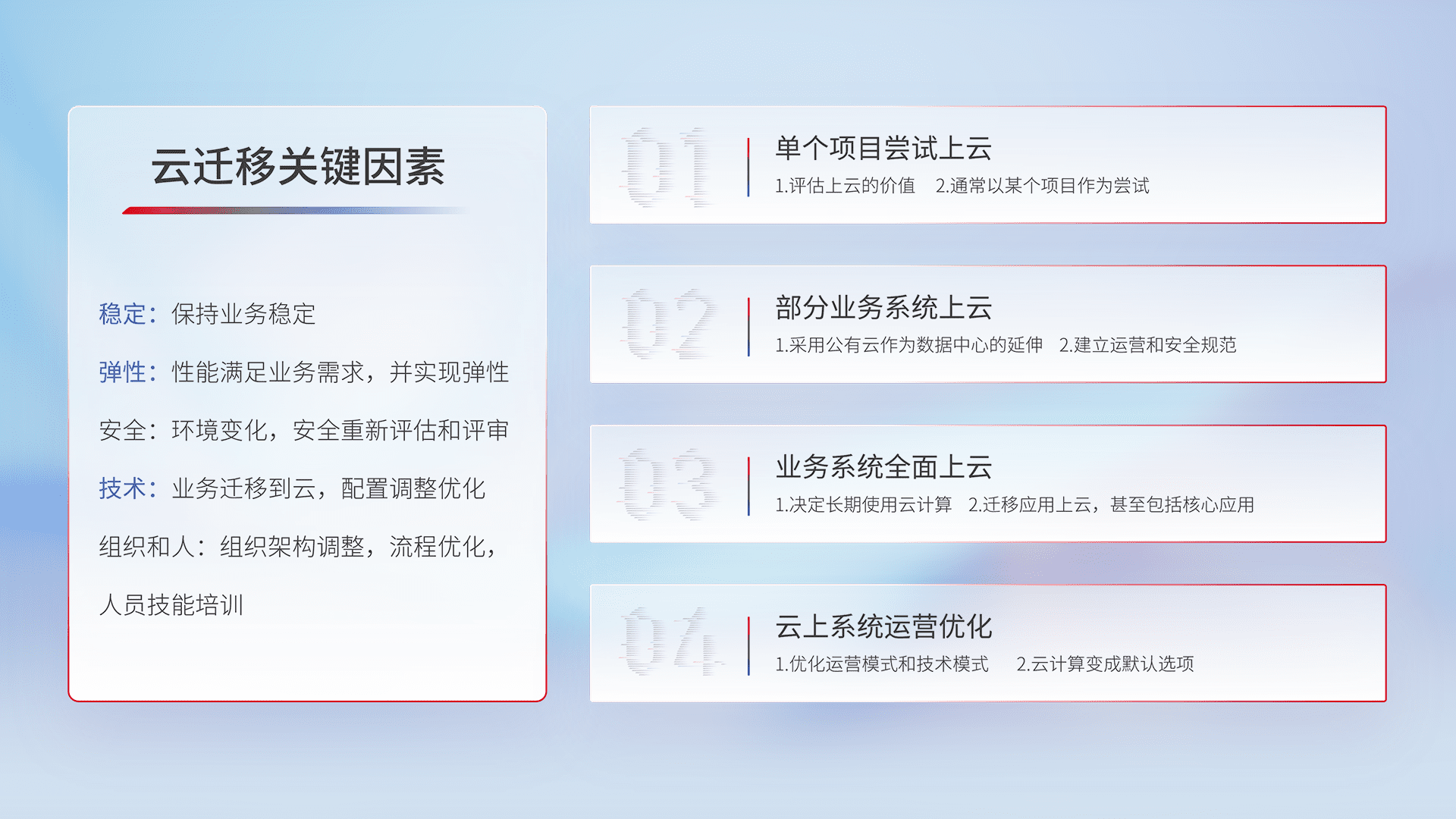 结合实际业务,,从规划设计、、、、云平台选型、、、、云原生改造、、、、数据迁移、、、、集成交付,,,迁移全过程为客户识别最佳上云路径,,,做好风险识别管理,,,,设计网络架构、、、、身份权限、、、、安全审计合规、、、操作审计、、、日志审计、、、、监控告警策略、、、多站点容灾设计等,,,对云上基础设施进行整体规划,,,,提升IT治理水平,,以满足弹性、、、、高可用、、、、高性能的需求。。。。
