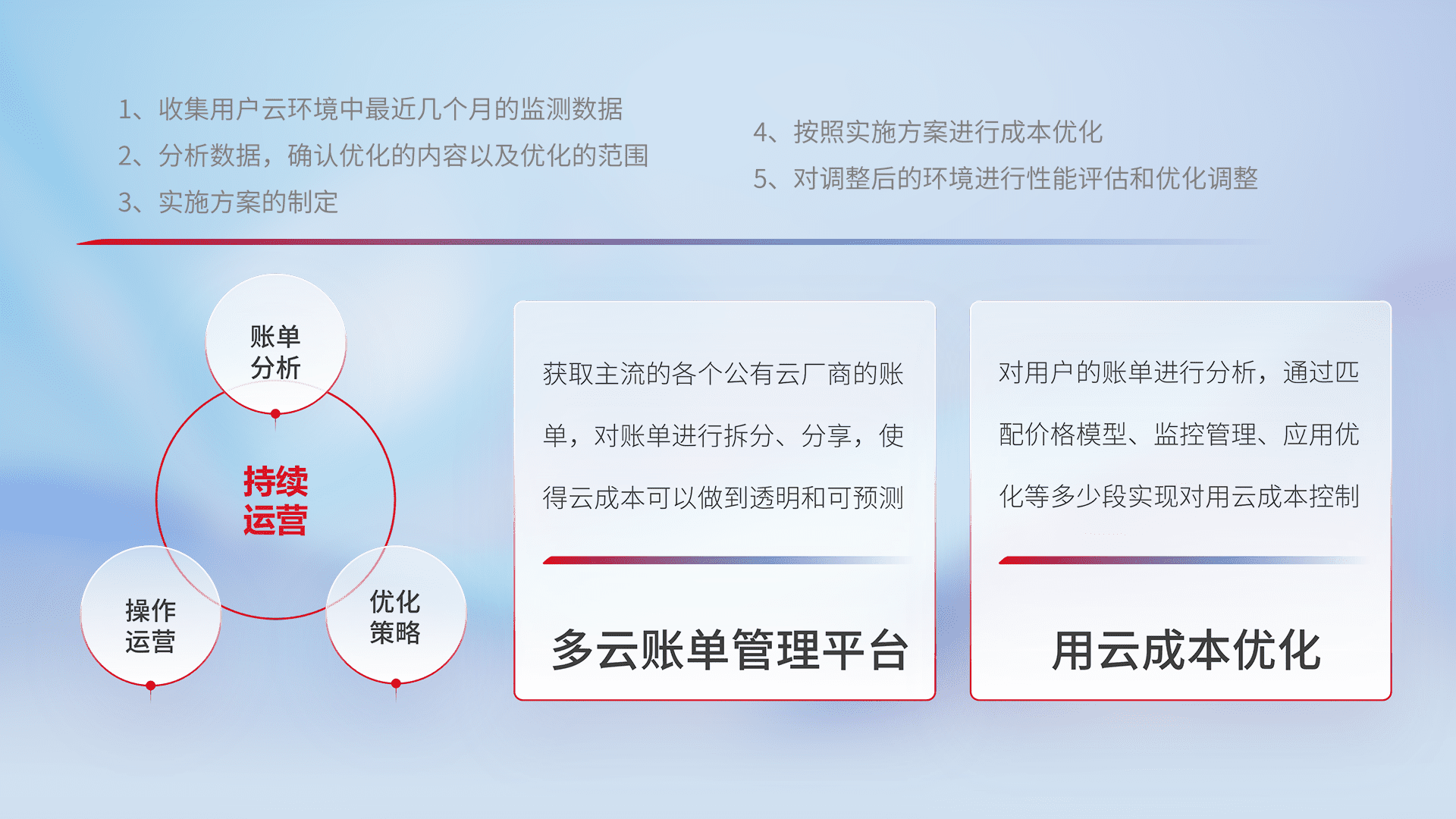 通过多云纳管,,,以统一的资源数据模型把客户的云资源进行抽象和封装,,,,进而实现对多云资源的统一操作,,保障云资源管理的可靠性、、稳定性与可用性。。量身定制化运维内容,,,,配置、、开发运维、、、、补丁管理、、、、备份、、、监控、、认证和访问管理、、、、审计和日常巡检等,,,,保障在用云过程中的可靠度,,稳定度以及高可用率。。